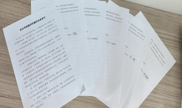 接着,全体教师签订承诺书。教师们在承诺书上许下郑重承诺:遵守教育法律法规,恪守教师职业道德,尊重学生人格,关心学生身心健康,严格要求自己,不断提高教育教学水平,为学生的成长和发展贡献自己的力量。