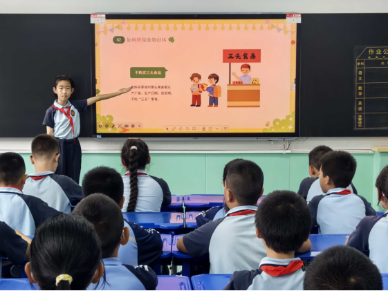 学校大屏播放食品安全科普视频,学生代表进行食品安全主题的广播站讲话,宣传合理营养均衡膳食以及食品安全的重要性,号召师生树立食品安全观念。