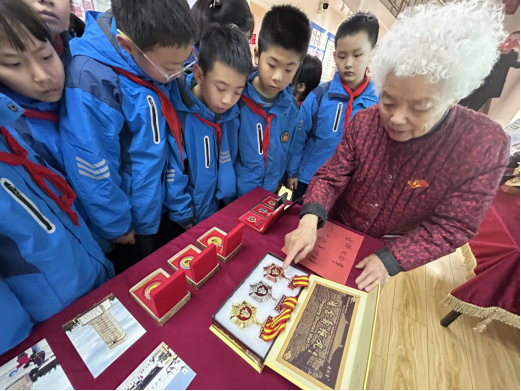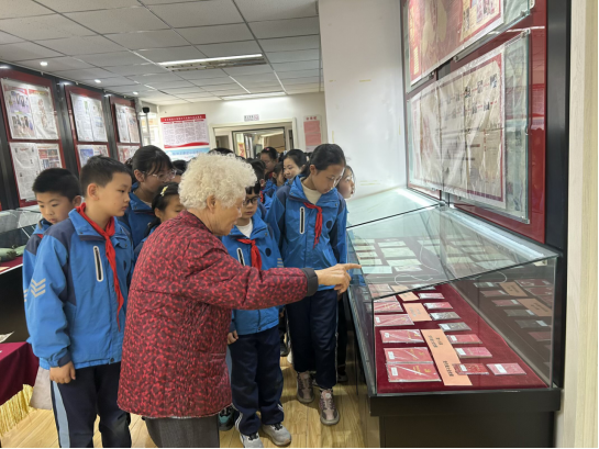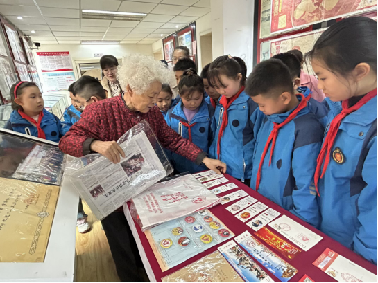 接着,社区雷锋藏品收藏者王奶奶带领同学们来到雷锋物品陈列台,担任起专属讲解员。陈列台上,雷锋日记、纪念邮票、宣传画报、老书籍等一件件珍贵藏品整齐摆放,承载着难忘的时代记忆。王奶奶逐一为孩子们介绍每件藏品的来历与背后的故事,讲述藏品与雷锋精神之间的联结,让孩子们透过实物触摸历史,深刻理解每一件藏品所蕴含的无私奉献、爱岗敬业的精神内核。孩子们凑近展柜,眼神专注,不时举手提问,在王奶奶的耐心解答中,对雷锋精神有了更真切、更深刻的理解。