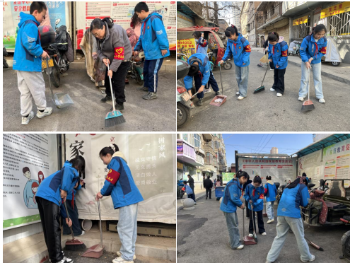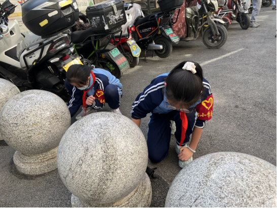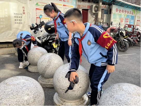 劳动现场,队员们个个干劲十足,充分展现出不怕脏、不怕累的优良作风。地面清洁小队的队员们俯身清扫校园及校门口的垃圾、落叶,仔细清理角落的杂物,不放过任何一处卫生死角;宣传栏擦拭小队的队员们则分工协作,有的沾水清洗抹布,有的认真擦拭法治长廊、公益宣传栏的玻璃与版面,将宣传栏上的灰尘擦拭得一干二净,让法治知识与文明标语清晰醒目。队员们相互配合、互帮互助,红彤彤的红领巾在劳动的身影旁格外耀眼,每一个忙碌的身影,都是对雷锋精神最生动的践行。
