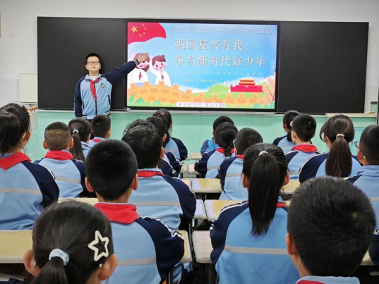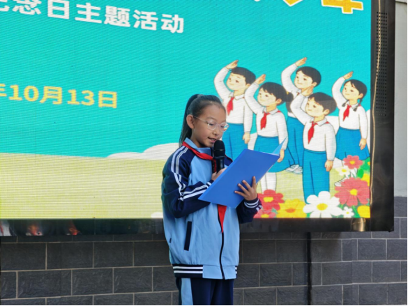 随后,四年级一班的王佳淼作为老队员代表发言,她说到:国家的未来在我们青少年的手中。作为少先队员,我们要肩负起时代的重任,努力学习,不断提升自己的综合素质,我们还要继承和发扬少先队的优良传统,争做文明有礼、团结友爱、乐于助人的好少年。