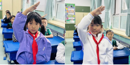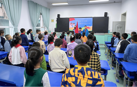 学校大队部旗手走进二年级教室,专门开展少先队出旗示范。旗手们先完整呈现标准出旗流程,再针对握旗姿势、步伐配合等要点进行简单讲解与动作演示,让小队员们直观了解出旗规范,为后续加入少先队做好准备。