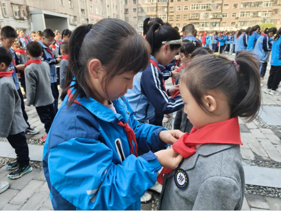 五年级少先队员代表以一种庄重而神圣的姿态,缓缓地为新队员们佩戴上了鲜艳的红领巾。他们的动作轻柔而坚定,每一道褶皱都仿佛在诉说着历史的传承与责任的接力。红领巾在新队员的胸前轻轻飘扬,如同初升的太阳般耀眼夺目,映衬着他们稚嫩却坚定的脸庞。这一刻,不仅是一种形式的传递,更是一种深刻信念和神圣责任的传承。