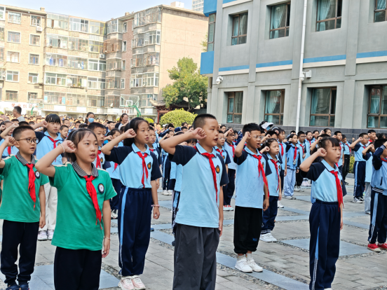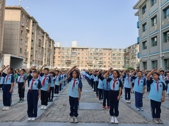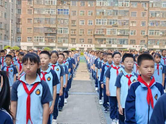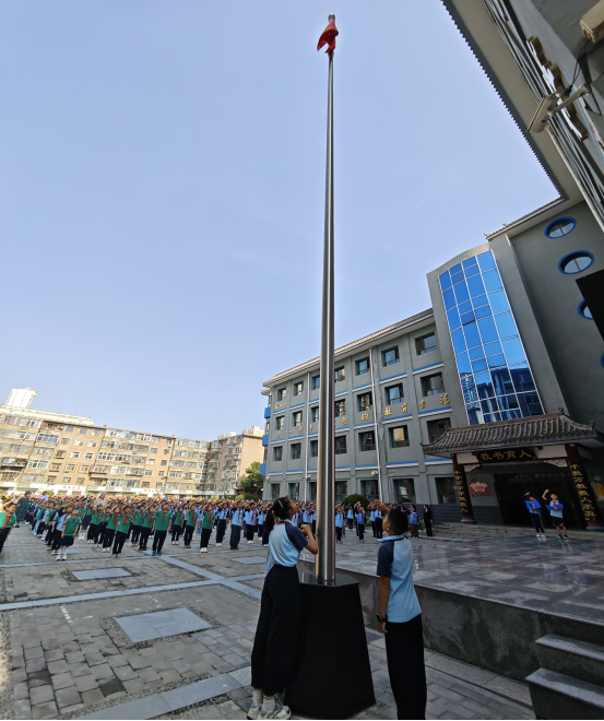 全体师生肃立操场,伴随着雄壮的国歌旋律,五星红旗冉冉升起。少先队员身着校服、佩戴红领巾,规范行队礼;其余师生行注目礼,目光追随着国旗,神情庄重。在庄严的氛围中,师生们共同感受国家荣誉与民族自豪感,让爱国情怀在心中深深扎根,为新学期注入坚定信念。