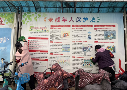 另一组负责宣传栏清洁的党员教师,各司其职、细致用心:有的用鸡毛掸子仔细掸去广告牌和宣传栏上的积尘,有的手持抹布认真擦拭公益广告牌、学校法治长廊的宣传栏,还有的细心清理防撞石球上的灰尘,让公益广告的温暖与法治知识的力量得以更鲜明地传递,让校园公共设施焕然一新。