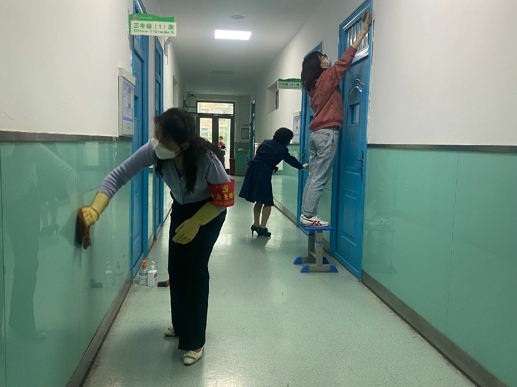 活动当天,教师志愿者也自发地在教学楼内进行劳动实践活动,志愿者们分工明确,有条不紊开展工作。大家整理楼道卫生、以及擦拭楼道墙面上的灰尘,更是手把手地给孩子们指导劳动技能,率先垂范,不怕脏不怕累,帮助同学们创造一个更舒适宽敞的学习和活动空间。