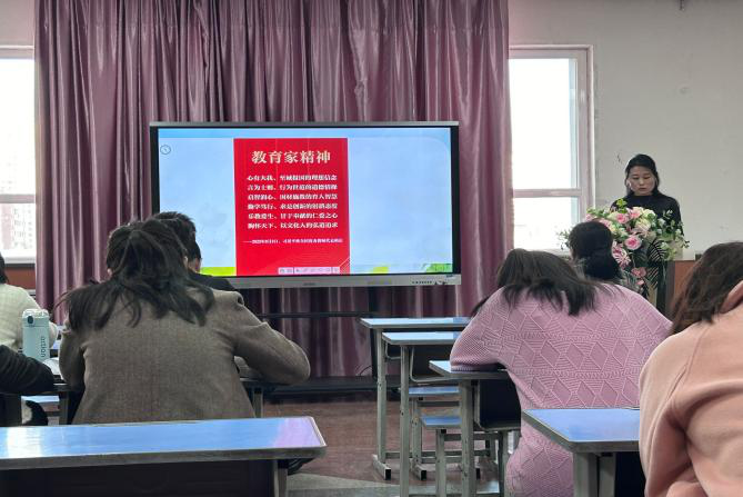 安排我校评选出的最美教师——马蓉蓉、樊红梅。她们代表师德师风高尚的教师向全体教师进行“讲好我的教育故事”宣讲。两位宣讲老师自己对师爱与教师责任的感悟,通过一个个鲜活的教育教学事例,使我们看到了他们是在用自己的实际行动诠释着师德与师魂、爱心与责任。工会主席何艳说:作为一名教师,要以“四有”好老师的标准要求自己的言行,做一位问心无愧的老师。